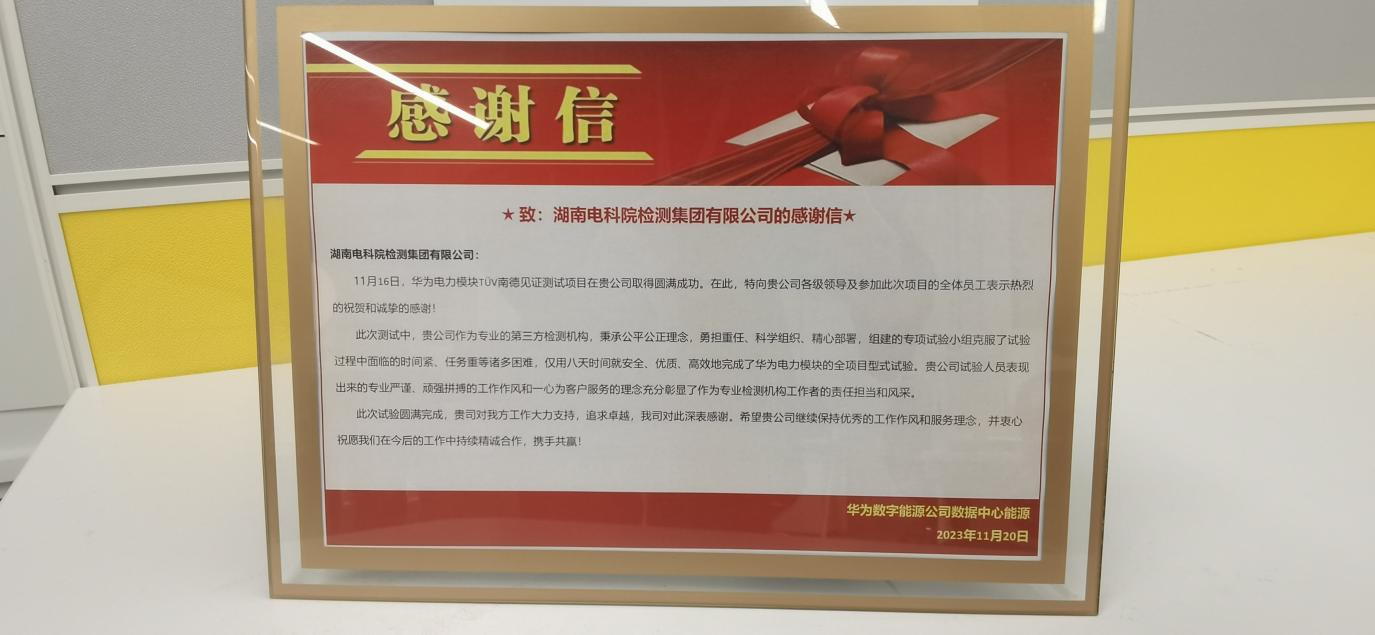 近日,我司收到華為數(shù)字能源公司發(fā)來的感謝信,對我司在華為電力模塊TüV南德見證測試項目中做出的突出貢獻給予充分肯定和衷心感謝。