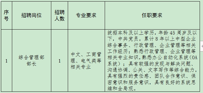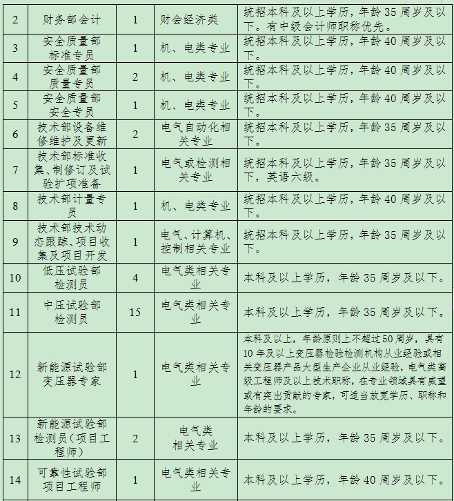 根據(jù)公司經(jīng)營(yíng)發(fā)展需要,現(xiàn)面向社會(huì)招聘行政管理、財(cái)務(wù)、安全質(zhì)量、變壓器專(zhuān)家、市場(chǎng)管理、檢測(cè)專(zhuān)業(yè)人才,有關(guān)事項(xiàng)公告如下: